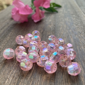 キラキラ輝く面カットと、大きな穴が特徴のプラスチックビーズです。